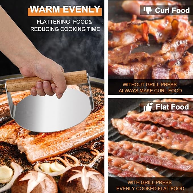 - 【Even Pressure for Juicy Results】: The hamburger smasher tool flat surface of the press ensures even pressure distribution, creating juicy, flavorful smashed burgers every time. hamburger press patty maker also helps achieve crispy, caramelized edges for that classic smash burger taste, making your homemade burgers rival those of a professional kitchen.