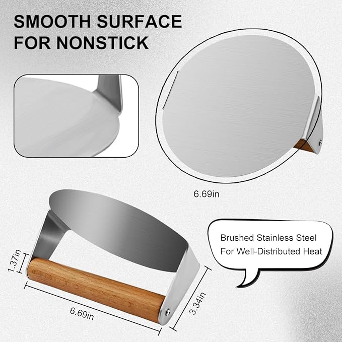 - 【High - Quality Stainless Steel】: Smash burger press Crafted from stainless steel, including the Wooden handle , burger press is not only stain - resistant and rustproof but also durable. The round grip handle uses laser welding technology, ensuring it stays firmly attached over time, providing long - lasting performance.