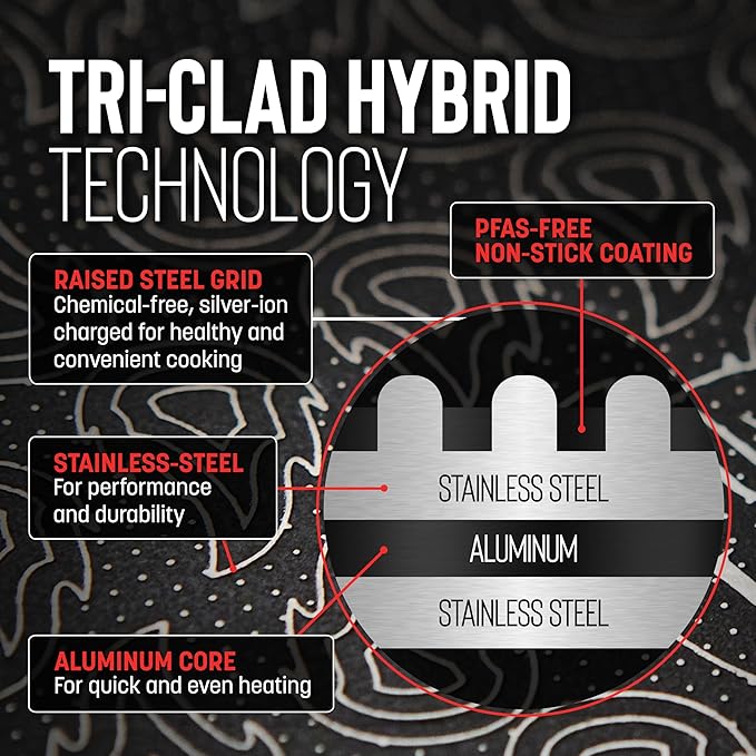 - TRI-CLAD STAINLESS for Quick & Even Heating: Hell’s Kitchen Hybrid Tri-Clad cookware features stainless steel construction with a conductive aluminum core, and a laser-etched flame pattern above a durable nonstick surface.
