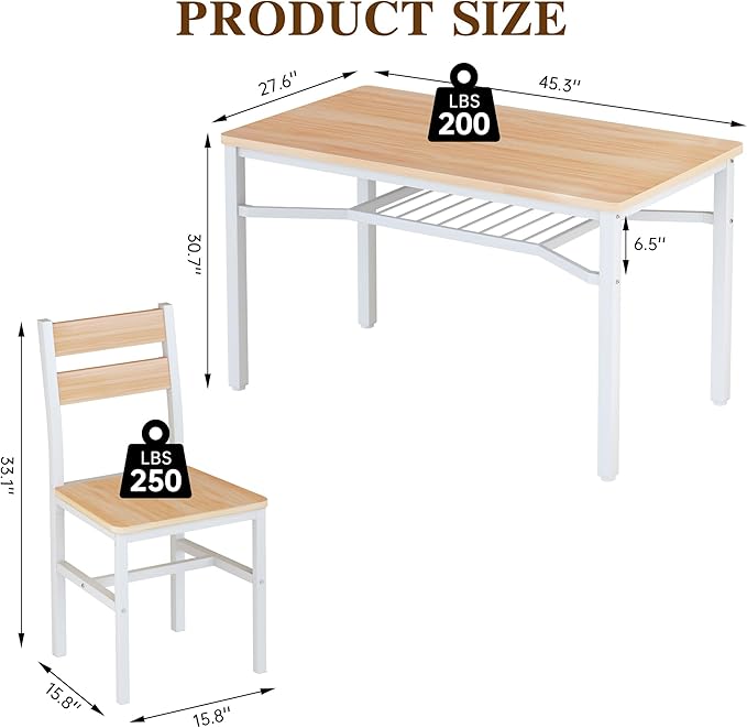 - Product Specifications: Table Dimensions: 45.3''*27.6''*30.7''; Weight Capacity: 200 lbs. Chair Dimensions: 15.8''*15.8''*33.1''; Weight Capacity: 250 lbs. Package Includes: 1 table, 4 chairs.