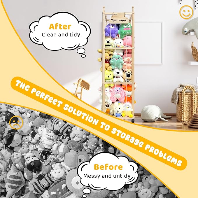 - The large stuffed animal storage measures 55.1 x 15.7 x 15.7″, with plenty of space to store children's stuffed animal companions. Its ingenious cage-like structure and elastic rope design make it easy and convenient to store and access toys. The included mesh pocket can be hung or tied to the shelf to store building blocks or small toys. This fun and independent storage method not only keeps the room tidy, but cultivates children's organizational skills and sense of responsibility in the game