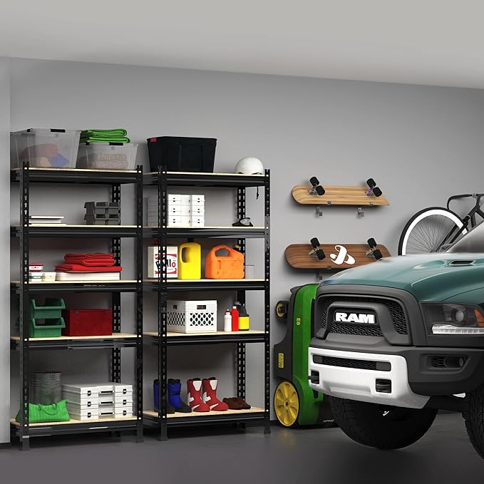 - 【 HEAVY DUTY & LONG-LASTING】 : This 5-tier garage shelving is made of high-quality 0.3" thicker MDF boards and 0.03" thicker heavy duty galvanized metal frame, sturdy and enduring. The metal frame is covered with premium powder coating to give it a smooth surface. Each shelf holds up to 265 lbs, 5 tier shelves' total max load weight is 1325 lbs