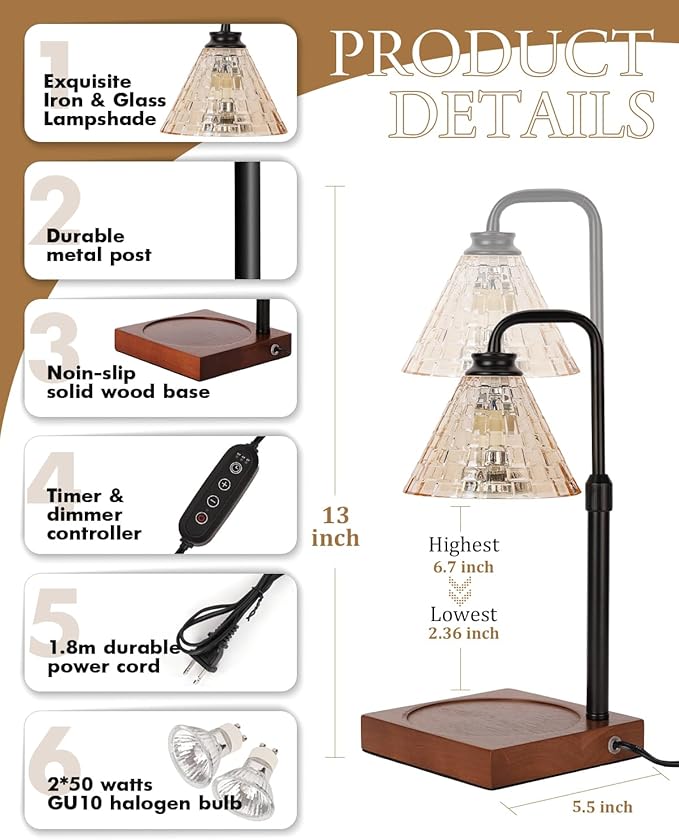 - Height Adjustable & Stable Base: The elegant wooden base(D"4.72in) ensure its stability, making you feel safer when using this candle warmer lamp for jar candles. With adjustable height function(H"2.36-4.72 in), this candle warmer lamp is suitable for all candle sizes
