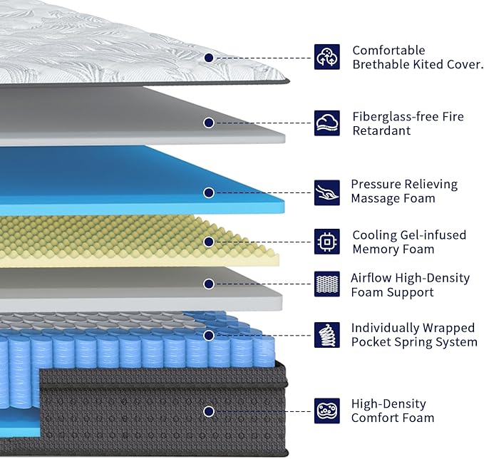 - 🛏️Pressure relief & edge support: Queen memory foam hybrid mattress offers a medium firmness sleep experience. Underneath the mattress cover lies a layer of comfort foam that conforms closely to the body's shape and relieves pain at pressure points. We have enhanced the hybrid mattress with individual pocketed springs, and the inner springs have two sizes of wire diameters: 2.0 mm (for mattress body support) and 2.2 mm (for edge support). This gives it better support and firmness without collapsing at the edges.