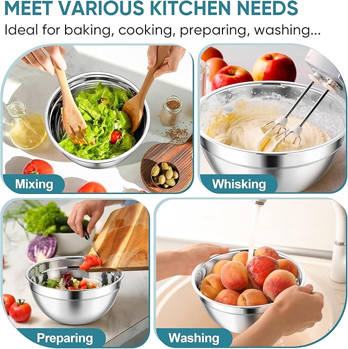 - STACKABLE & EASY TO CLEAN: Serving bowls can be nested neatly inside each other, Saving a lot of kitchen counter and cabinets space to keep them tidy and organized, Also convenient for carrying around and ideal for on-the-go use, Fingerprint-proof matte brushed exterior and mirror polished interior for easy clean, Bowls are dishwasher safe to save time and labor, But the lids hand washing only to maintain their tightness