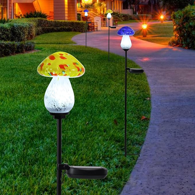 - 【Charming Garden Decor】Transform your outdoor space into a whimsical oasis! During the day, the mushroom-like life adds a vibrant charm to the path, courtyard or flower bed. At night, it becomes a soft ambient light source, projecting dreamy patterns through its textured glass. Multiple mushrooms can be matched to turn the outdoors into a magical garden.