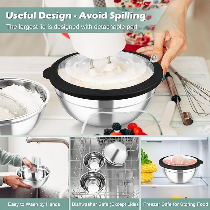- TRANSPARENT LIDS & 3 GRATERS: Every stainless steel mixing bowl offers a visible clear tight-fitting lid, Easy to see through and identify what’s in the bowl, Leak-proof to prevent liquid spills, Ideal for storing food in freezer to keep it fresh and clean, The largest lid has a detachable section, 3 grater attachments can be simply placed directly on the center of lid for slicing /grating /shredding, Practical for meal-preparing, No need to take away the entire lid to avoid splashing or spilling when whisking