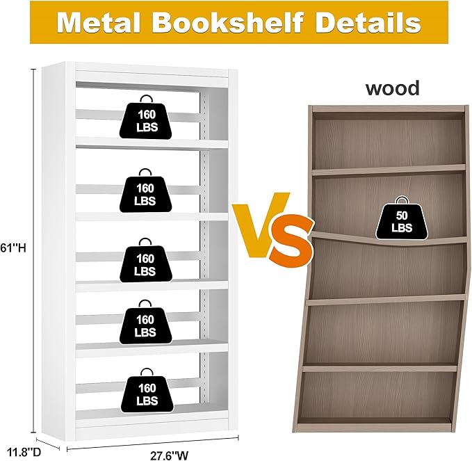 - Office Bookshelf Capacity: Constructed from solid cold-pressed steel, this tall book shelf supports up to 160 lbs per shelf, with a total weight capacity of 800 lbs. Bookshelves and bookcases keep books clean and secure