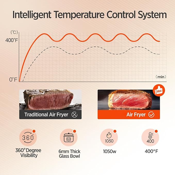 - 🌪️ Even Heat for Consistent Cooking: Engineered with a 360° hot air circulation system, this air fryer ensures that heat is evenly distributed around the glass bowl. This innovative design helps cook food uniformly, delivering delicious results with every use.