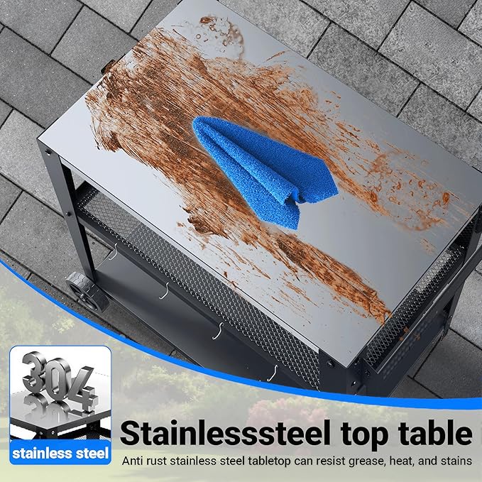 - Stainless Steel Top: The rust-proof stainless steel tabletop resists grease, heat, and stains. Wipe it down with a damp cloth for easy cleaning. The scratch-resistant surface maintains its appearance over time