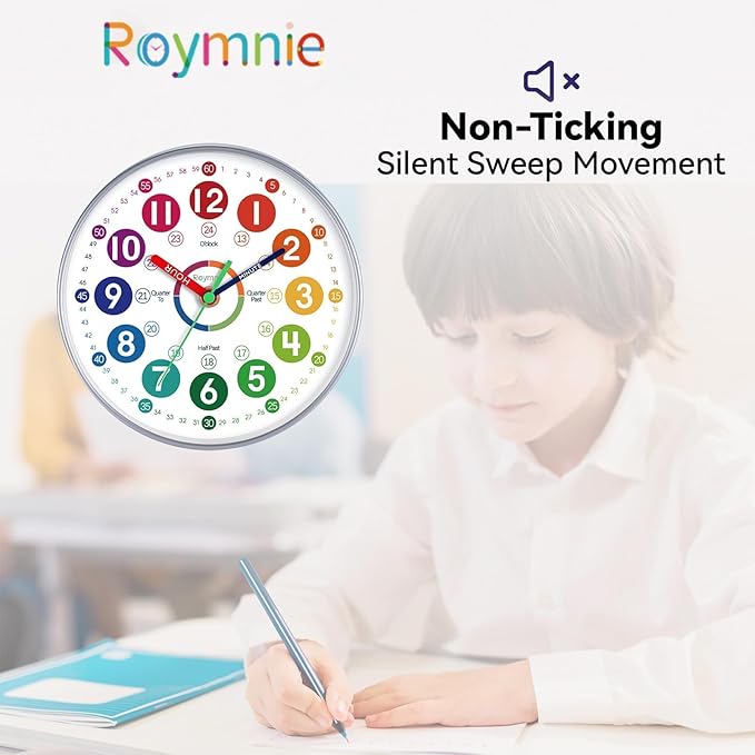 - 4、【Silent & Non-ticking】: Our telling time teaching clock is a silent and non-ticking clock with a stylish continuous sweep movement making it great room decor for kids rooms, classrooms nursery or home school and create a quiet place for children to study and rest.