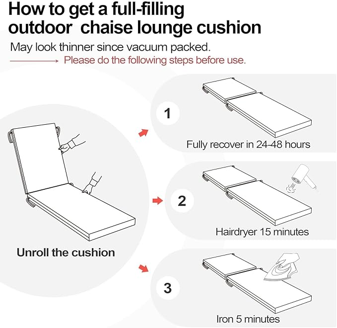 - Multiple Usage Scenes: These lounger cushions for outdoor furniture are the perfect upgrade for most 70”–72” chaise lounges. Ideal for transforming your patio, poolside, deck, or even indoor spaces into a comfortable oasis.