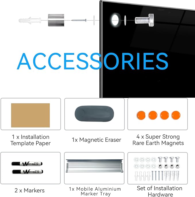- Easy To Install: Using our wall mounting kit (including a set of mounting accessories and a mounting template paper) and assembly instructions, you can easily hang the glass dry erase board on the wall. You can also secure the board vertically or horizontally, providing flexibility to fit your specific space and needs