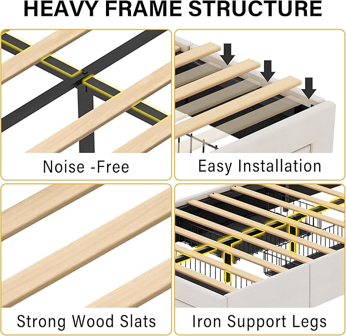 - Sturdy Construction & Strong Support: In addition to the solid metal frame and central cross design of twelve thickened wooden slats, we have added a heavy duty steel support bar under the headboard to give the bed frame a weight capacity of 700 lbs