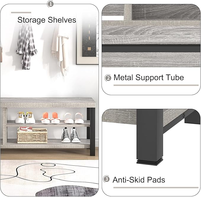 - Stylish & Versatile Storage Bench: Featuring a vintage minimalist design with a light grey wood grain surface and black powder-coated metal frame, this shoe bench suits any entryway, hallway, or bedroom, perfect as an end of bed bench or window bench