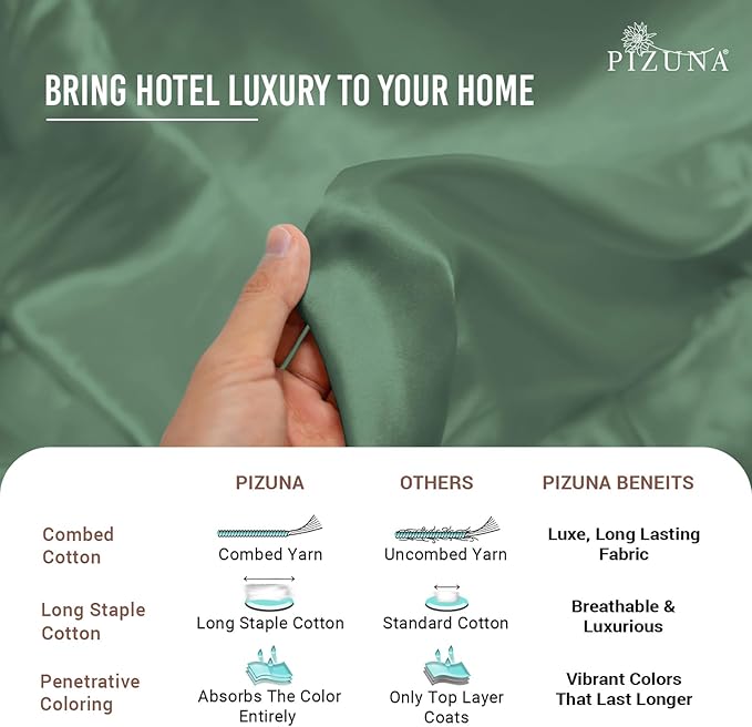 Pizuna Pure 100% Cotton Queen Duvet Cover Set, Luxurious 400 Thread Count Long Staple Cotton Sateen Weave with Button Closure (Combed Hedge Green Cotton Duvet Cover Queen)