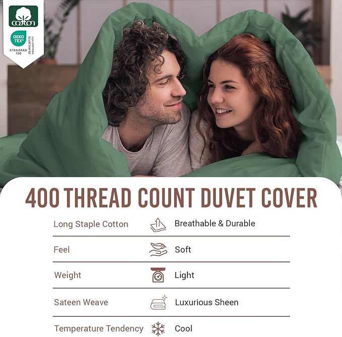 - Cool, Breathable & Smooth: Crafted from 100% Long-Staple Combed Cotton Sateen Weave, this 400 Thread Count duvet cover queen size with it's lighweight texture is made with specially compacted yarn. Minimal artificial processing makes this queen duvet cover gentle on all skin types, prevents night sweats, absorbs moisture and regulates body temperature to sleep cool while maintaining the elegant hotel look.