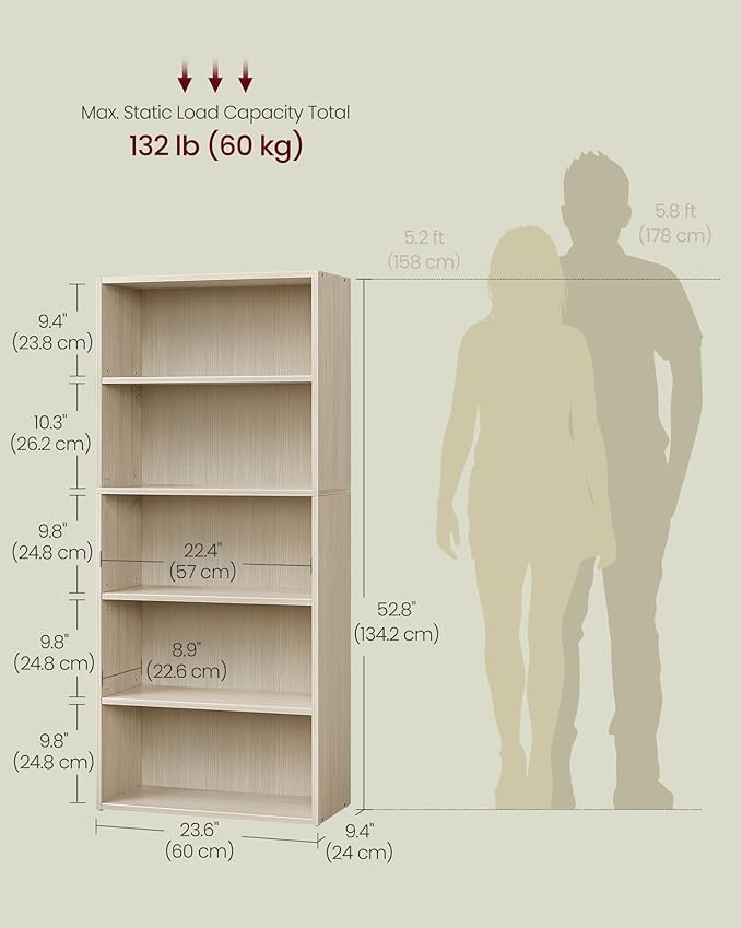 VASAGLE Custos Collection - Bookshelf, 5-Tier Bookcase, Book Shelf, Open Storage Shelf, 9.4 x 23.6 x 52.8 Inches, for Living Room, Home Office, Dinning Room, Natural Beige ULBC165L01