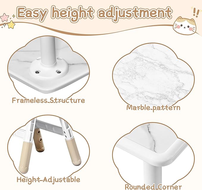 - 1 ✨ 【Height-Adjustable Design】 Table: Features 7 adjustable height levels from 17.7” to 21.65”, accommodating children from ages 3 to 8. Chairs: 4 chairs with 3 adjustable height settings (10.6” to 12.2”) ensure a perfect fit for growing kids.