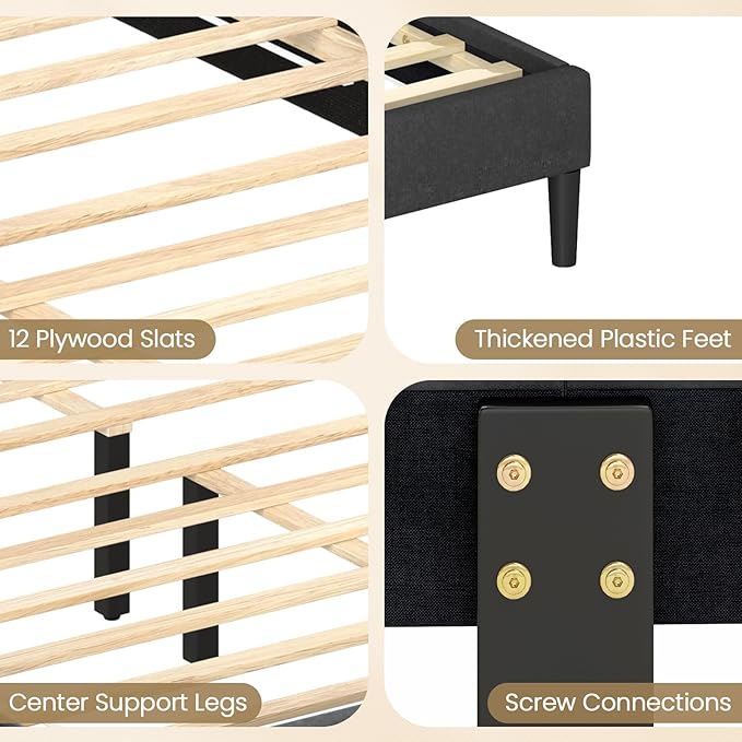 - No Box Spring Needed and Easy Assembly: The platform bed with 12 plywood slats eliminates the need for a box spring, offering exceptional support and extending the life of your mattress. The slats are pre-connected, ensuring a hassle-free setup process.