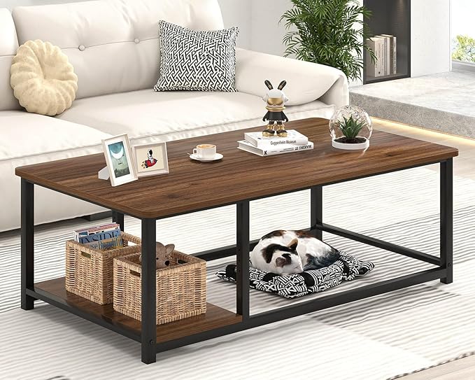 EXCEFUR Modern Coffee Table, Rustic Wood and Metal Center Table for Living Room, Industrial Rectangle Cocktail Tea Table with Storage Shelf, Walnut, 47 Inch