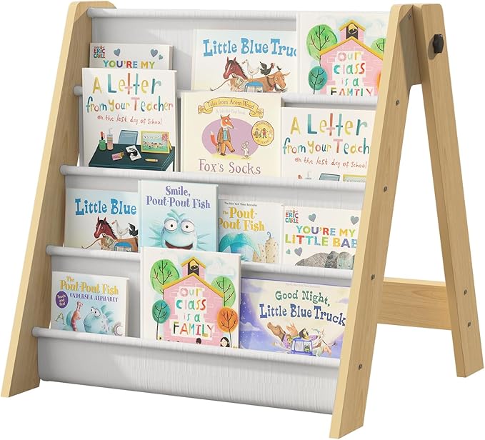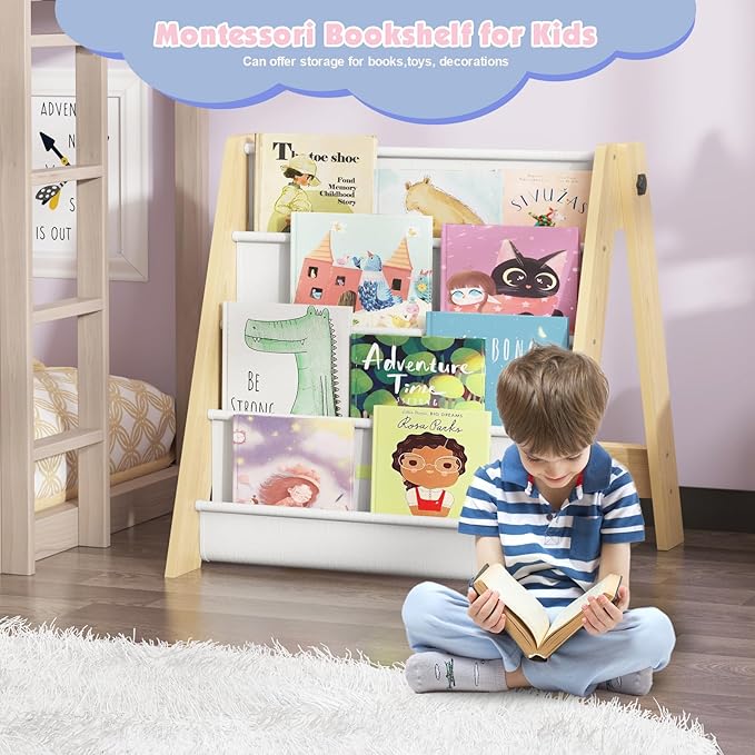 - 【Versatile & Accessible Storage】 Featuring four deep fabric pockets, this bookshelf can hold a variety of books, from board books to coloring books. The Montessori bookshelf design encourages kids to organize their reading materials and access them with ease. Perfect as a baby bookshelf, toddler bookshelf, or book organizer in any kids' room.