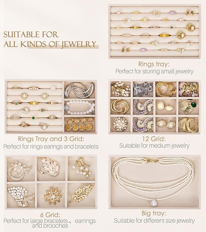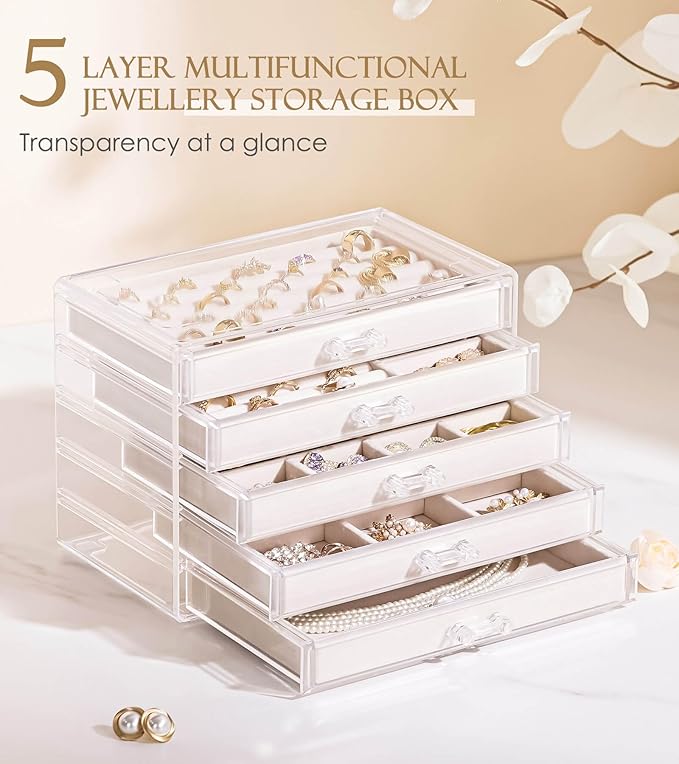 - LARGE AND VERSATILE STORAGE CAPACITY: Measuring 9.25 x 5.31 x 6.69 inches, this large Jewelry Organizer features 5 identical drawers with removable dividers. You can adjust the compartments to fit different jewelry. The velvet - lined tray can be removed for storing cosmetics like lipsticks. It saves desktop space while offering ample storage