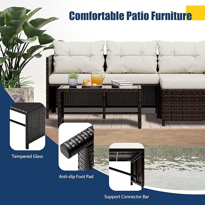 Vongrasig 3 Piece Patio Furniture Sets, All-Weather PE Wicker Outdoor Sofa Couch Sectional Set, Small Conversation Set for Garden/Patio w/Cushion, Glass Table, (Beige)