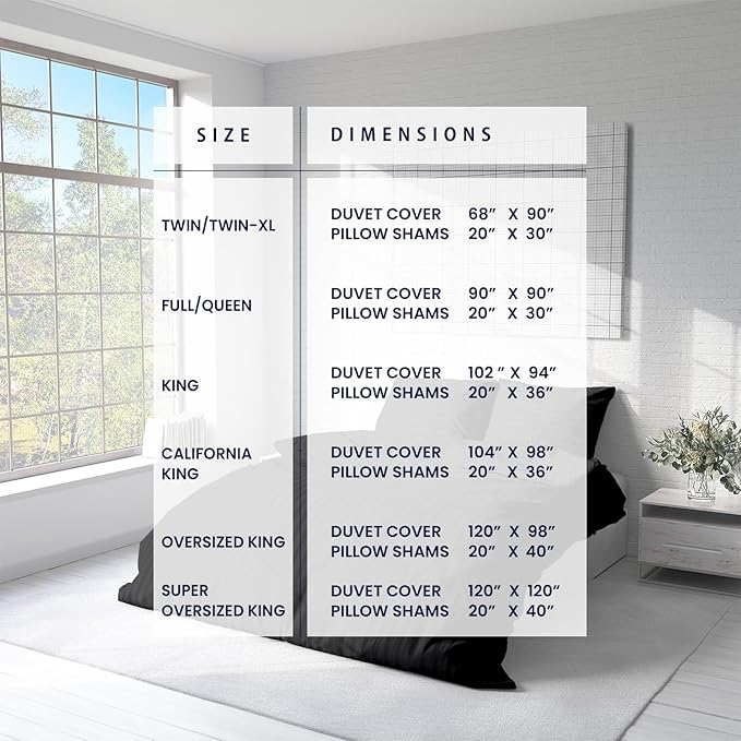 - KING SIZE DUVET COVER – LUXURY HOTEL QUALITY: Includes 1 King Duvet Cover (102" X 94") and 2 Pillow Shams (20" X 36") for a perfect fit. Comforter not included. Please measure your insert before purchasing.