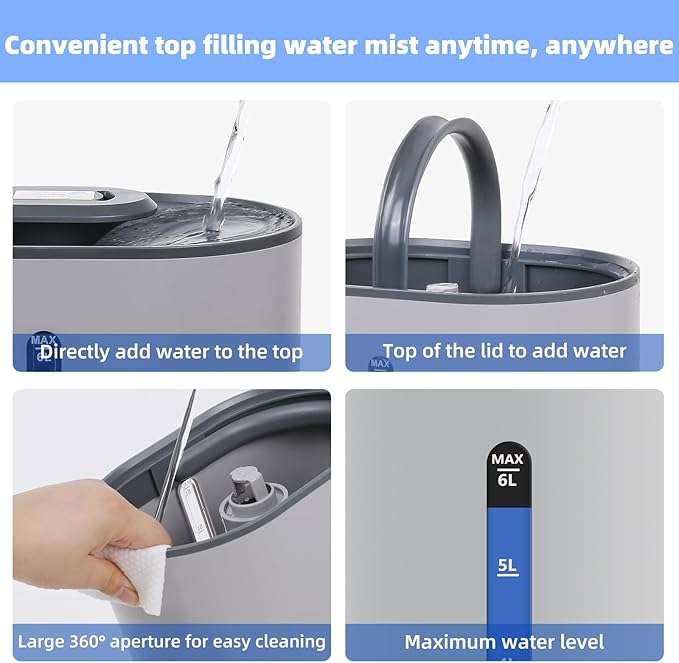 - Humidifiers for Large Room:Our 6L humidifiers operates 60 hours per fill for extended use. Ideal for large homes, it reduces refills for uninterrupted, consistent humidity. 360° rotating nozzles disperse mist in any direction, providing even humidity and creating a soothing environment,It‘s good for humidifiers for home and humidifiers for plants