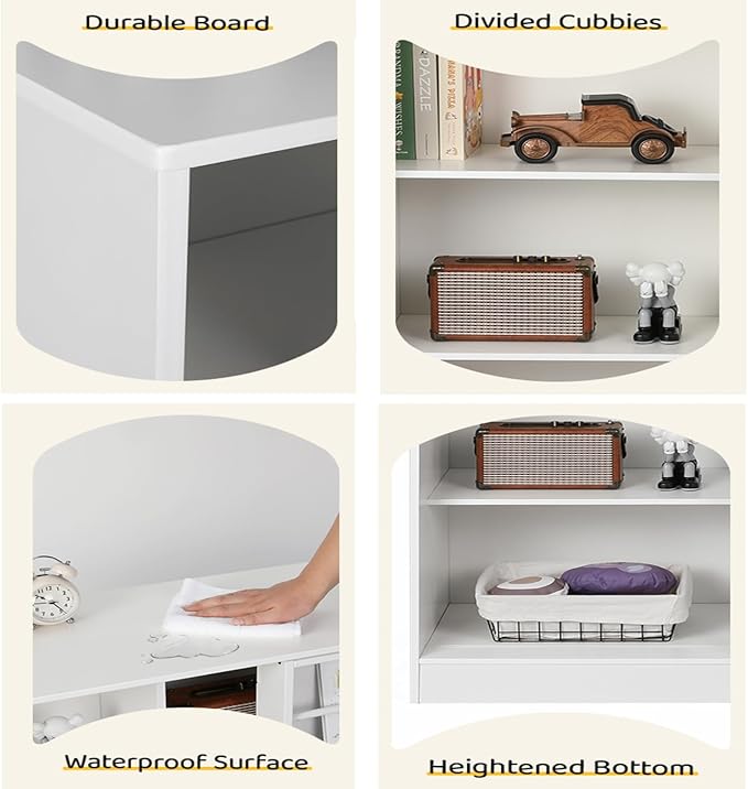 - Kids-Friendly Design For Safety - The edges and corners of this daycare cabinet are smoothly rounded off in case of any wood splinter that may hurt your little one. 3-level hight storage cubies, perfect for toddlers and kids.