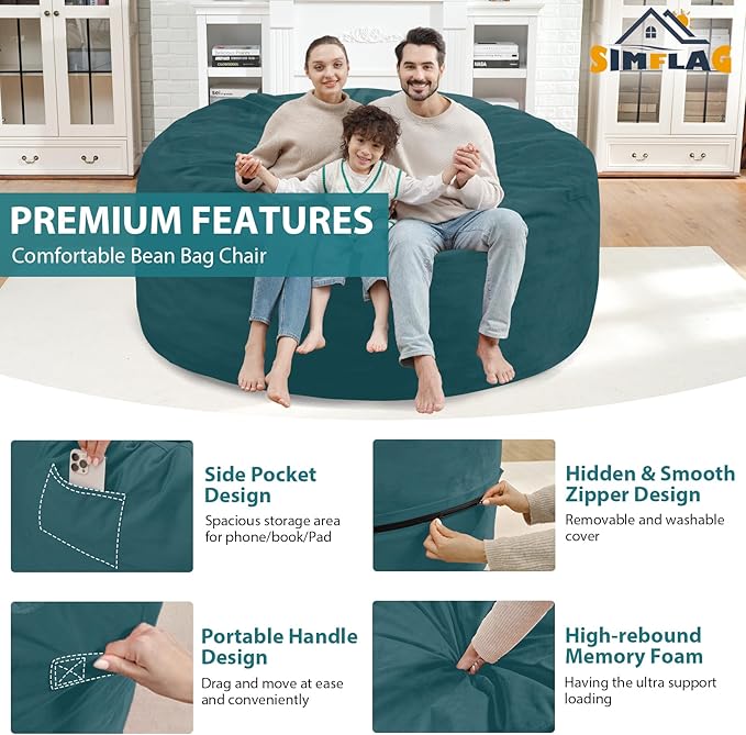 - CONVENIENT DESIGN: SIMFLAG bean bag sofa design with 4 thoughtful details, firstly, a pull-tab makes the bean bag chair easy to move around and manipulate. Second, an inter linner can contains the bean bag and allows you to wash the outside cover without spilling the beans. Third, a medium-sized pocket for your stuff. Fourth, a hidden zipper can prevent scratches to a people's delicate skin.
