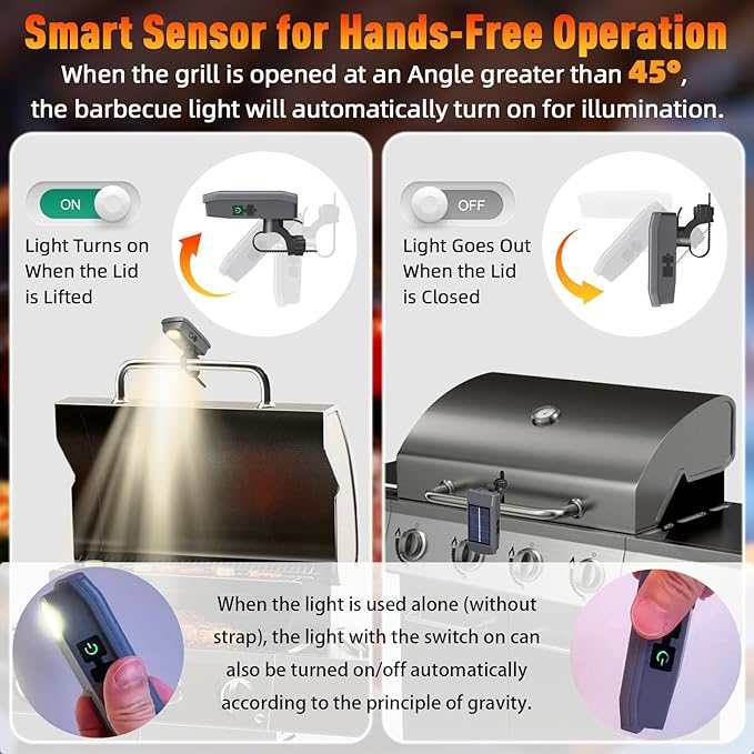 - 【Smart Sensor for Hands-Free Operation】This bbq light automatically turns on when you open the grill lid and off when you close it. Let you enjoy the hands-free lighting that saves energy.Make this one of your bbq grill accessories! The automatic on/off gravity principle also applies to handheld LED lights (without strap).