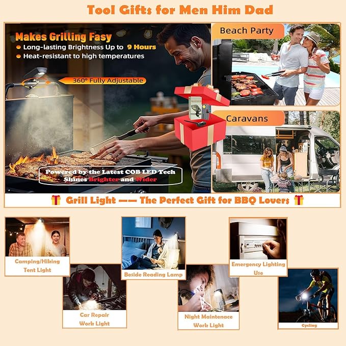 - 【Not just a grill light, Multi-functional LED Work Light】Night BBQ / Camping / Maintenance Essential ! One light for all outdoor lighting needs.A practical yet thoughtful tool gift for dads, husbands, and outdoor lovers/adventurers. Ideal for birthdays, Father's Day or Christmas. Light up every moment with our light!