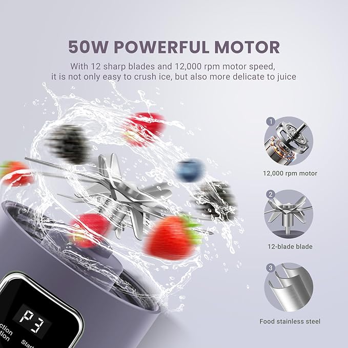 - 【Safety & Food-Grade 12 Blades 】Our Portable juicer made of high-quality food-grade, non-toxic ABS and 304 stainless steelFeatures an elegant hand-held M-cup lid design that not only looks beautiful but also allows for easy disassembly of the cup and machine.Features a robust 50W motor and 12 stainless steel blades spinning at 12,000 RPM.It can easily crush ice cubes and frozen fruits.Elevate your blending experience with convenience and speed.