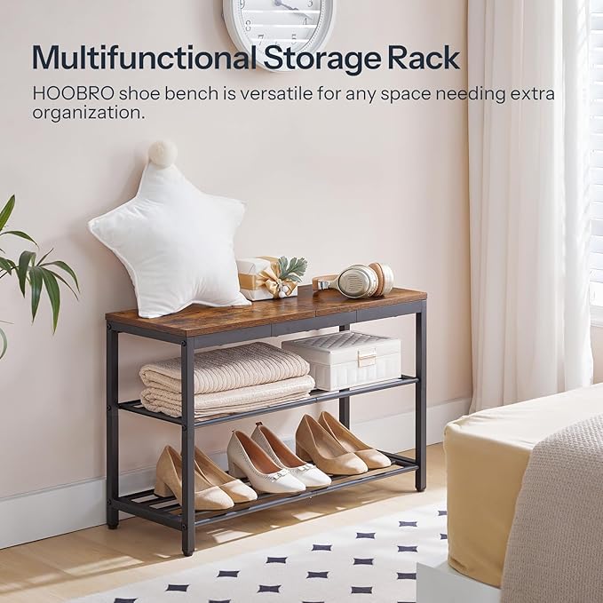 HOOBRO Shoe Storage Bench, 29.5" L Entryway Bench Organizer, 3-Tier Shoe Rack for Closet, Shoe Shelf with Wooden Top Seat, Loads 300 lb, Space-Saving, Rustic Brown and Black BF76HX01