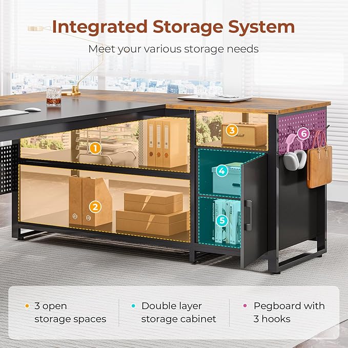 - 【Amazing Storage Capabilities】Compared to most executive desks, the most surprising thing is that we have a mobile filing cabinet with drawers for you to store documents and personal items and your printer can be placed on the locker to keep your workspace clean. Plus, with open shelves, storage cabinets, pegboards and hooks, eaily keep your daily need within reach.