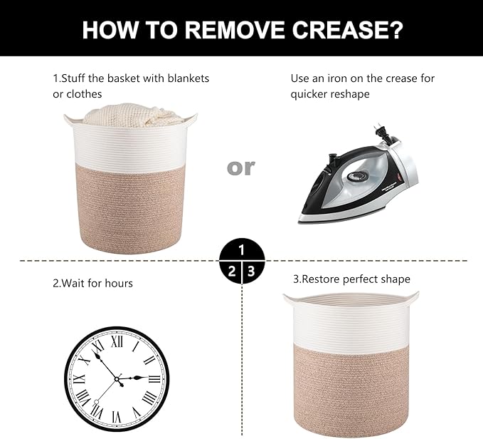 - Note: Laundry basket comes folded and may have creases. Fully filling the toy basket with blankets or clothes will help reshape the laundry basket. Using steam or ironing to reshape more quickly. The rope hamper is machine washable. If machine washing the laundry hamper, please put it in a wash bag for delicate and air dry it