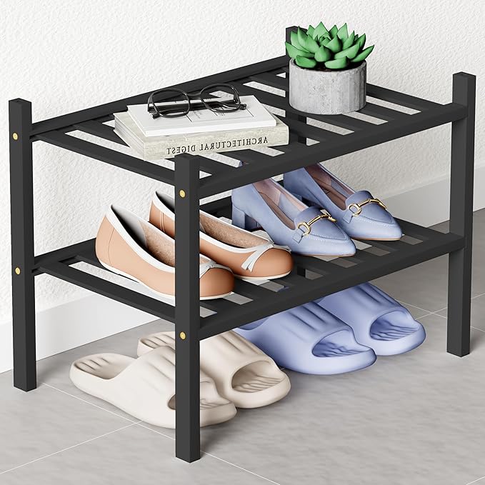 Smiry Bamboo Shoe Rack for Closet, 2 Tier Small Wooden Stackable Shoe Organizer, Free Standing Shoes Storage Shelf for Entryway, Front Door Entrance, Black
