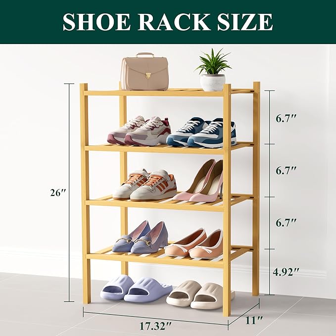 Smiry Bamboo Shoe Rack for Closet, 4 Tier Small Wooden Stackable Shoe Organizer, Free Standing Shoes Storage Shelf for Entryway, Front Door Entrance, Natural