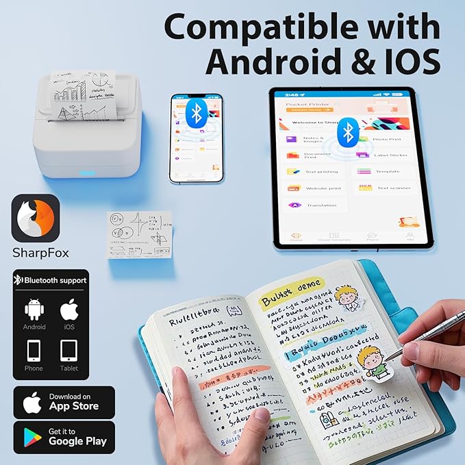 - BLUETOOTH THERMAL PRINTER - π©ππππππππ πͺππππππ - This mini printer sticker maker is perfect for creating labels, stickers, and notes wirelessly from your phone or tablet! Compatible with iOS & Android, you can and print from SharpFox apps via Bluetooth hassle-free.