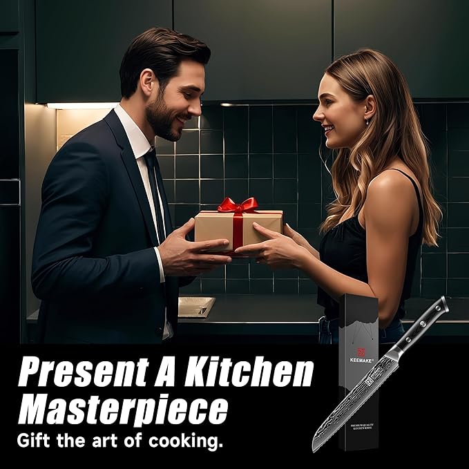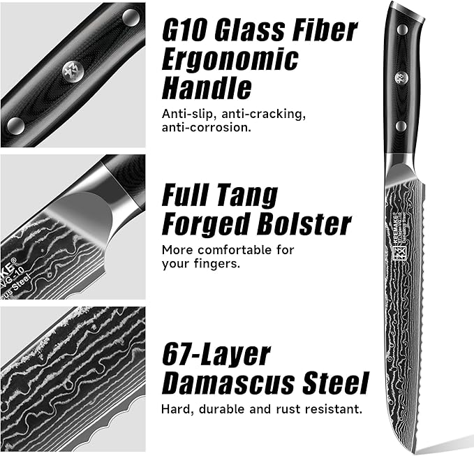 - Damascus Knife: Crafted with 67-layer Damascus steel with VG10 Japanese steel core, the 8 inch bread knife not only enhances aesthetics but also combines exceptional sharpness, durability, and corrosion resistance