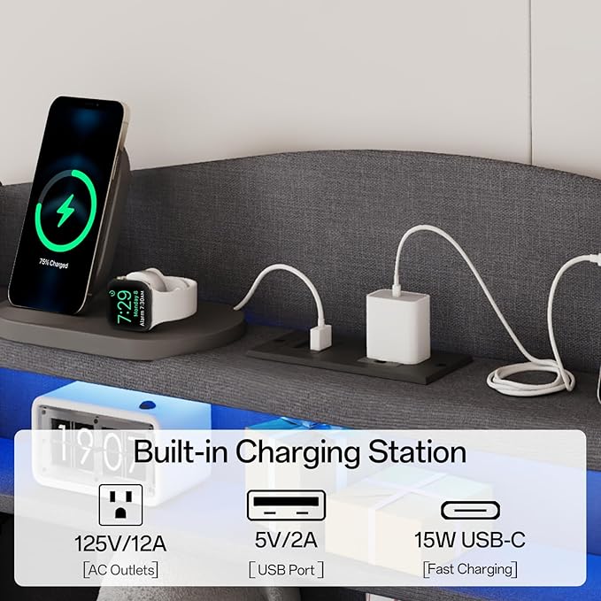- 【Twin Size bed Frame with Headboard】: Wrapped in a meticulously chosen linen fabric, this bed frame boasts a chic design with a open bookshelf and hidden storage compartments on the headboard, providing a stylish and practical solution for organizing books, alarms, or decorative items within easy reach. Additionally, this bed frame features a charging station, which includes a AC outlets, a USB-A, and a USB-C port for charging multiple devices simultaneously