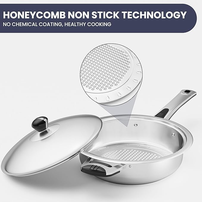 - NATURALLY SAFE NON-STICK, EASY TO CLEAN : Enjoy healthy cooking with this frying pan set stainless steel. The honeycomb texture creates a naturally non-stick surface that’s easy to clean—perfect for daily meals.