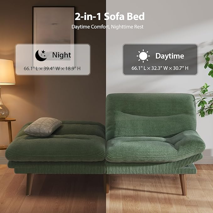 - VERSATILE SOFA BED: This corduroy futon sofa bed easily converts into a comfortable sleeper, Loveseat mode 66''X20.8''X30.7'' (L*W*H),Sofa bed mode : 66.1''X39.4''X18.94''(L*W*H).perfect for small spaces, living rooms, offices, or guest rooms, offering both functionality and space-saving design.