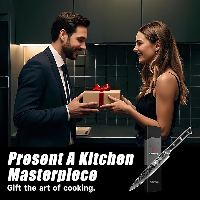 - Elegant Design: Combining striking Damascus visuals with a sleek G10 handle, the carving knife doubles as a stylish kitchen accessory, also making it a thoughtful present with elegant box for BBQ enthusiasts and culinary experts