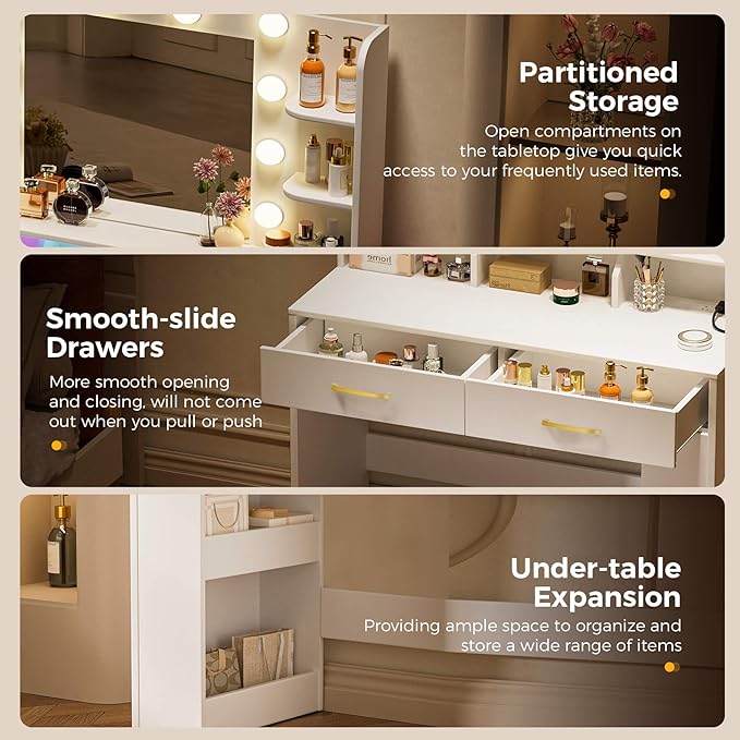 - 【Ample Storage Space】 Equipped with an undertable side cabinet, 2 drawers, 4 open shelves and 3 cubies, this vanity desk ensure that there is storage space in every place you reach with your fingers, your spray bottles, lipstick, lotions, Makeup brush & etc, allowing all of the beauty supplies tidy in this makeup dressing table
