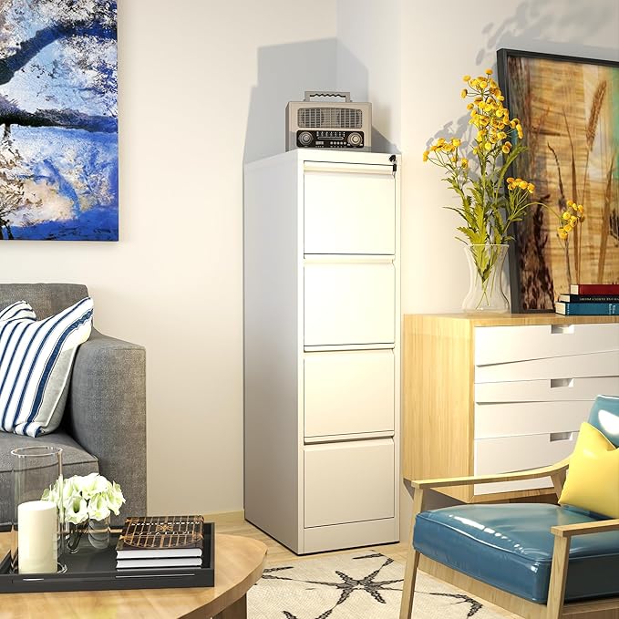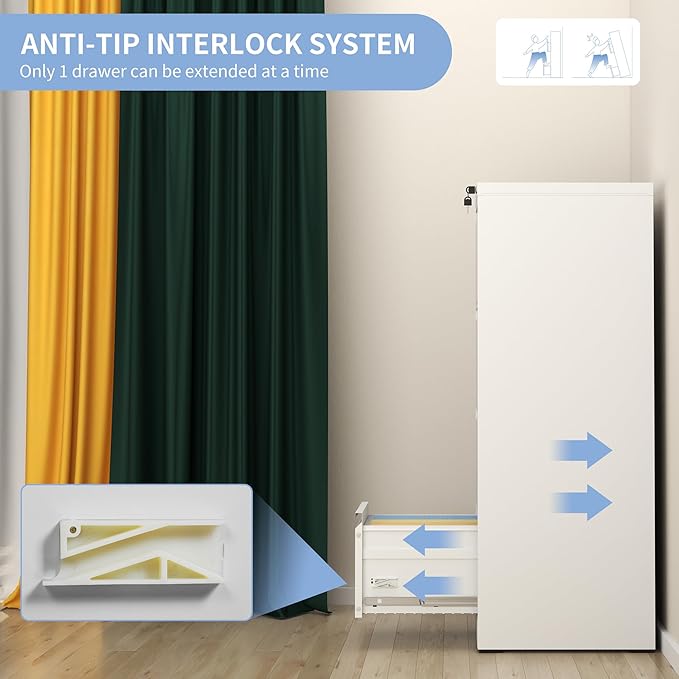 - ◉【Lockable & Secure】The white 4 drawer filing cabinet features a locking mechanism with interlock systems that secure all drawers simultaneously, enhancing the security of your documents. The anti-tilt system prevents tipping when multiple drawers are open, ensuring your safety.