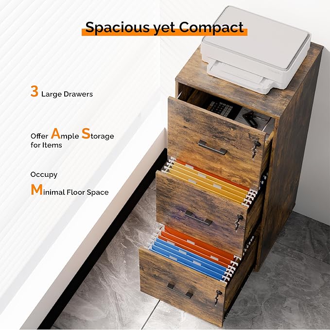 - 【Spacious yet Compact】This tall file cabinet features 3 drawers, offering abundant storage to neatly organize your paperwork and ensuring easy access, all while occupying minimal floor space.