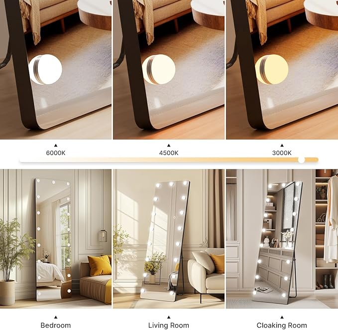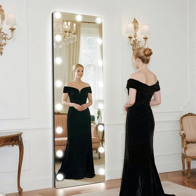 - ✨[Professional Hollywood Lighting] – This full-length LED mirror features evenly distributed bulbs with adjustable brightness (cool, warm, and natural light), providing perfect illumination for makeup application, outfit checks, and full-body viewing.
